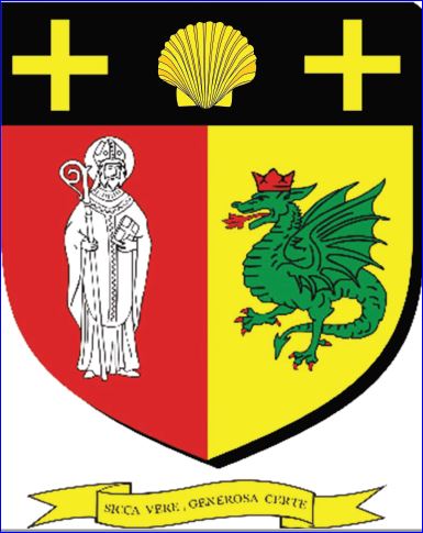 (2015, 2018) Parti: au 1er de gueules à saint Hilaire en évêque d'argent, au 2e d'or au dragon de sinople, armé, lampassé et couronné de gueules; le tout sommé d'un chef diminué de sable chargé d'une coquille versée d'or accostée de deux croisettes du même.