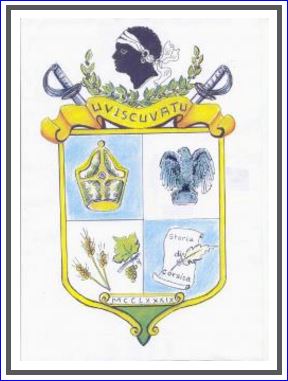 Écartelé: Au 1er d'azur à la mitre d'argent bordée et ornée d'or, au 2e d'argent à l'aigle impériale d'azur, au 3e d'argent au bouquet de trois épis de blé tigés d'or et posé en bande, senestré d'une grappe de raisin du même tigée et feuillée de sinople, au 4e d'azur au parchemin d'argent, posé en pal et chargé de l'inscription de sable « Storia di Corsica » sur trois lignes et à la plume d'argent brochant en barre.