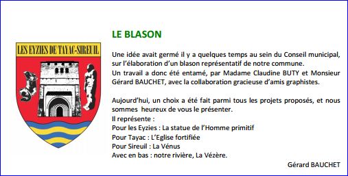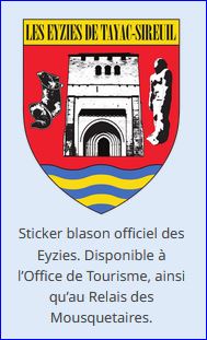 (2015) De gueules au portail de l'église fortifiée de Tayac, adextré de la statue de Vénus de Sireuil et senestré de la statue de l'Homme Primitif des Eyzies, le tout d'argent; à la champagne ondée cousue d'azur chargée de deux fasces ondées d'or.