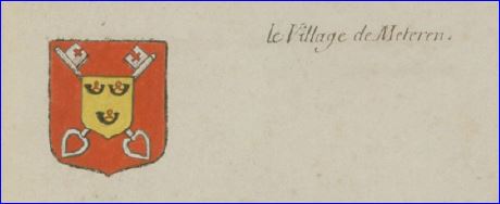 De gueules à deux clefs d'argent passées en sautoir, les pannetons affrontés; sur le tout, d'or à trois cors de sable, liés de gueules, le pavillon à dextre.