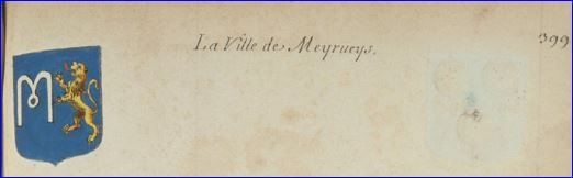 (1402) D'azur au lion d'or, lampassé de gueules, tenant de sa patte antérieure senestre une lettre onciale M d'argent.