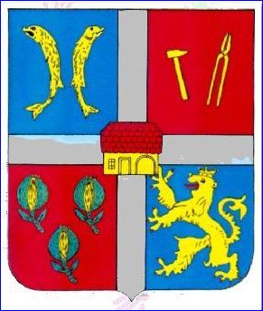 (1995) Écartelé: au 1er d'azur à deux bars adossés d'or, au 2e de gueules à un marteau posé en bande à dextre et une pince d'or posée en barre à senestre, au 3e de gueules à trois grenades d'or tigées et feuillées de sinople, au 4e d'azur au lion couronné d'or, armé et lampassé de gueules; à la croix estrée d'argent brochant sur la partition; à la maison d'or essorée de gueules surbrochant en abîme.
