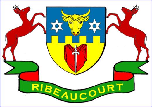 (2015) Coupé crénelé: au 1er d'azur au rencontre de taureau d'or bouclé de gueules, accosté de deux molettes d'argent, au 2e d'or au manteau de centurion romain et à l'épée basse d'argent, brochant.
