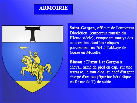 D'azur à saint Gorgon d'or à cheval armé de pied en cap, sur une terrasse du même; au chef d'argent chargé d'un tau de sable.