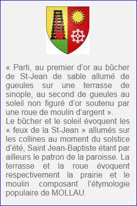 Parti: au 1er d'or au bûcher de la Saint-Jean de sable enflammé de gueules sur une terrasse de sinople; au 2e de gueules à la roue de moulin d'argent surmontée d'un soleil non figuré d'or.