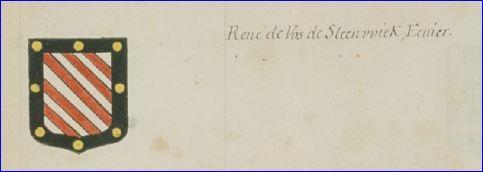 Coticé d'argent et de gueules de dix pièces; à la bordure de sable chargée de huit besants d'or.