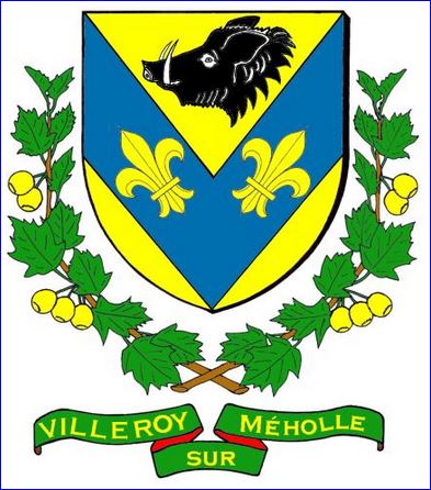 (2015) D'or au chevron renversé et abaissé d'azur, chargé de deux fleurs lis d'or posées dans le sens du chevron renversé et surmonté d'une hure de sanglier de sable, défendue et allumée d'argent.