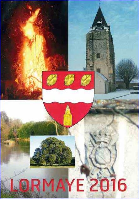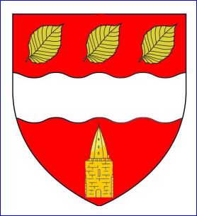 (2015) De gueules à la fasce ondée d'argent accompagnée en chef de trois feuilles d'orme d'or posées en barre et en pointe d'un clocher du même.