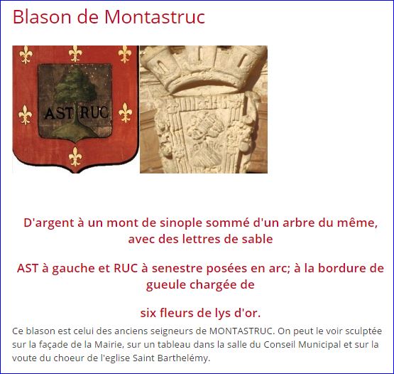 D'argent au mont de sinople sommé d'un arbre du même, accosté des inscriptions AST et RUC en lettres capitales de sable; à la bordure de gueules chargée de six fleurs de lis d'or.