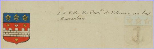 De gueules à fasce crénelée d'argent, maçonnée de sable, surmontée d'un croissant d'argent et accompagnée de trois étoiles du même; au chef cousu d'azur chargé de trois fleurs de lis d'or.