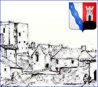 Parti: au 1er d'argent à la bande ondée d'azur chargée de trois fers de moulin du champ, au 2e de gueules à la tour d'argent ouverte, ajourée et maçonnée de sable sur un rocher du même mouvant de la pointe.