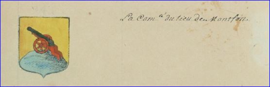 D'or à la pièce de canon de sable, montée sur un affût de gueules et posée sur une montagne d'azur.
