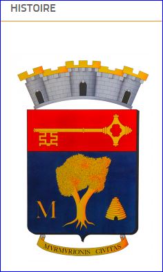 (1980) D'azur au mûrier arraché d'or, adextré de la lettre capitale M et senestré d'une ruche, le tout du même; au chef cousu de gueules chargé d'un clef d'or posée en fasce.