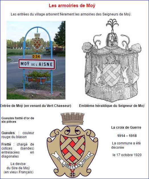 Elle renoue aussi avec son passé en adoptant les armoiries de ses plus anciens seigneurs connus depuis le XIe siècle, les Moy grands serviteurs du royaume. Ils portaient