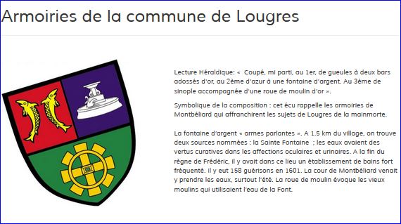 Coupé: au 1er parti au I de gueules à deux bars adossés d'or, au II d'azur à la fontaine du lieu d'argent, au 2e de sinople à la roue de moulin d'or.