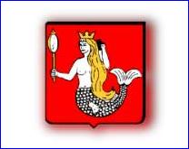 De gueules à la sirène d'argent, couronnée et chevelée d'or, se coiffant avec une brosse de sable en se regardant dans un miroir d'argent emmanché et garni d'or.
