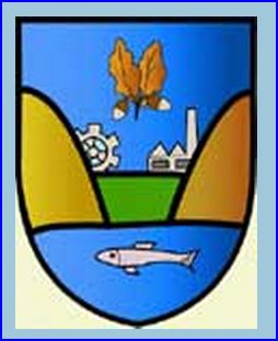 D'azur à deux rochers d'or mouvant des flancs et enserrant une terrasse de sinople sur laquelle sont posées une roue d'engrenage d'argent mouvant du rocher dextre et d'une usine du même mouvant du rocher senestre, surmontées d'une branche de chêne d'or englantée d'argent; le tout posé sur une champagne d'azur chargée d'un poisson d'argent.