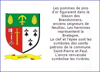 Parti: au 1er de gueules à la clé d'argent à dextre et à l'épée basse d'or à senestre, au 2e d'argent à trois mouchetures d'hermine de sable; le tout sommé d'un chef de sinople chargé d'une ancre marine versée d'or accostée de deux pommes de pin du même, le pédoncule en bas.