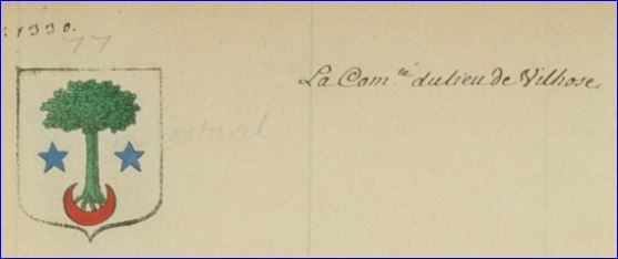 D'argent à l'arbre arraché de sinople accosté de deux étoiles d'azur et soutenu d'un croissant de gueules.