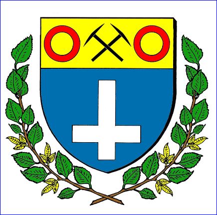 (2015) D'azur à la croix latine renversée d'argent; au chef d'or chargé de deux pics de carrier de sable passés en sautoir et accostés de deux annelets de gueules.