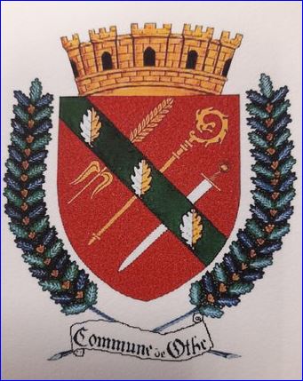 De gueules à la crosse épiscopale d'or, accostée en chef d'un épi feuillé du même et en pointe d'une épée d'argent garnie d'or renversée, le tout posé en barre; à la bande de sinople chargée de trois feuilles de chêne posées à plomb, parties d'argent et d'or, brochant sur le tout.