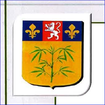 (2007) D'or à la branche de chanvre feuillée de sinople; au chef tiercé en pal aux I et et III d'azur à la fleur de lis d'or et au II de gueules au lion d'argent.