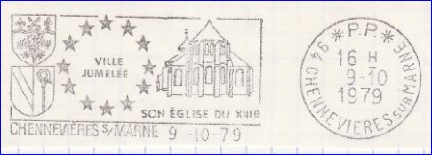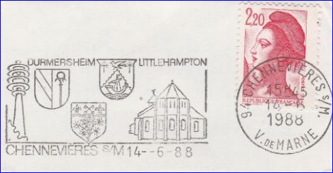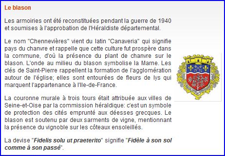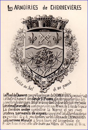 (1955) De gueules au plant de chanvre d'argent fruité d'or, mouvant de la pointe; au chef d'azur, soutenu d'une divise ondée d'argent et chargé de deux clefs d'argent passées en sautoir, accostées de deux fleurs de lis d'or.