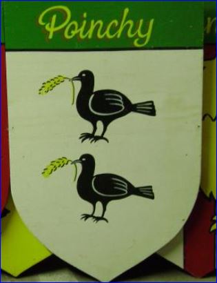 D'argent à deux corneilles de sable, l'une au-dessus de l'autre, tenant chacune un épi de blé d'or dans son bec.