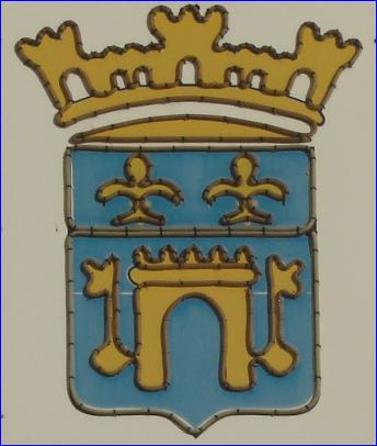 D'or à la porte fortifiée et crénelée d'or, maçonnée de sable, accostée de deux clefs d'argent, les pannetons affrontés; au chef d'azur chargé de deux fleurs de lis d'or.