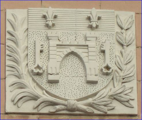 Blason sculpté sur la façade de la mairie.
