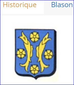 D'azur à deux bars adossés d'or accompagnés de quatre rose du même pointées de sinople.