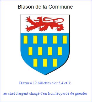 D'azur à douze billettes d'or ordonnées 5, 4 et 3; au chef d'argent chargé d'un lion léopardé de gueules.