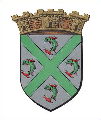 D'argent au sautoir de sinople, cantonné de quatre dauphins du même barbés, crêtés, lorrés, oreillés et peautrés de gueules.