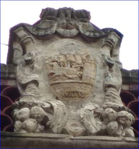 Armes de la ville sculptées au fronton de l'ancien hôtel de ville (1882).