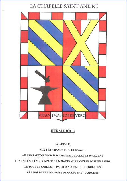 (2016) Écartelé: Aux 1er et 4e bandé d'or et d'azur, au 2e parti de gueules et d'argent, au sautoir d'or brochant, au 3e parti d'argent et de gueules, à l'enclume de sable sommée d'un marteau du même, les deux pièces brochantes; le tout enfermé dans une bordure réduite componée d'argent et de gueules.