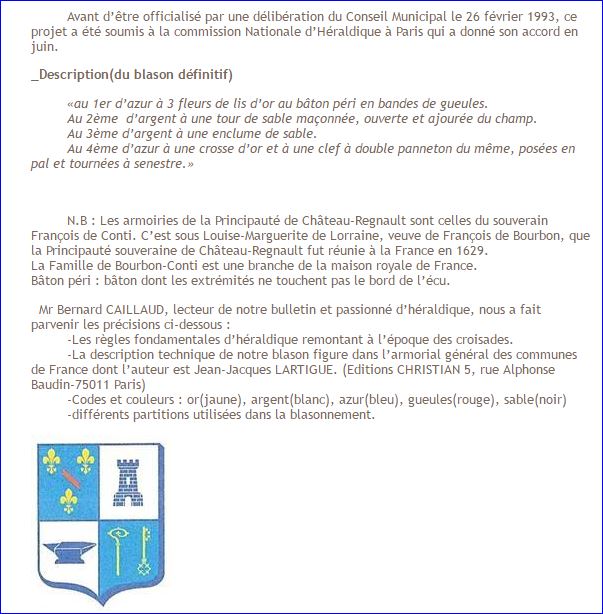 (1993) Écartelé: au 1er d'azur à trois fleurs de lis d'or, au bâton péri en bande de gueules en abîme, au 2e d'argent à la tour de sable, ouverte, ajourée et maçonnée du champ, au 3e d'argent à l'enclume de sable, au 4e d'azur à la crosse contournée d'or senestrée d'une clef contournée du même.