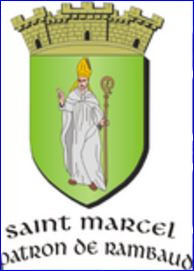 De sinople à saint Marcel, évêque, bénissant, de carnation, vêtu d'argent, chevelé, mitré et crossé d'or.