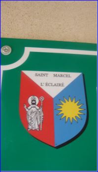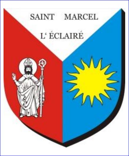 (2014) Tiercé en pairle: au 1er d'argent aux inscriptions de sable « SAINT MARCEL » et L'ÉCLAIRÉ » sur deux lignes, au 2e de gueules à saint Marcel , évêque, auréolé, crossé et bénissant d'argent, au 3e d'azur au soleil non figuré d'or.