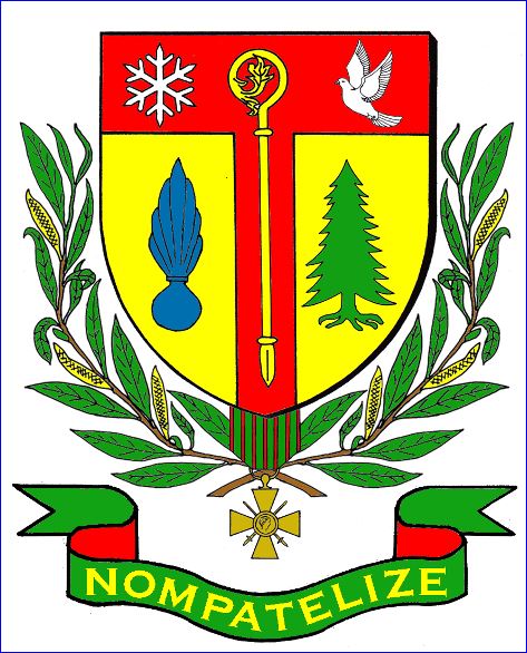 (2016) D'or à la grenade d’azur à dextre et au sapin arraché de sinople à senestre; au chef-pal de gueules chargé d'une crosse d'or accostée en chef d’un cristal de neige d'argent et à senestre d’une colombe en vol du même.