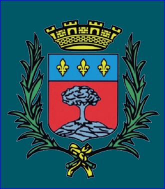 De gueules au chêne posé sur un mont, le tout d'argent; au chef d'azur chargé de trois fleurs de lis d'or.