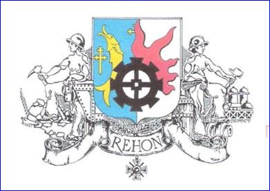 Mi-parti: au 1er d'azur semé de croisettes recroisetées au pied fiché d'or à deux bars adossés de même, au 2e d'argent à la flamme de gueules; à la roue de moulin de sable brochant en pointe sur la partition.