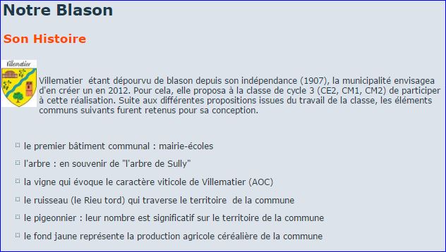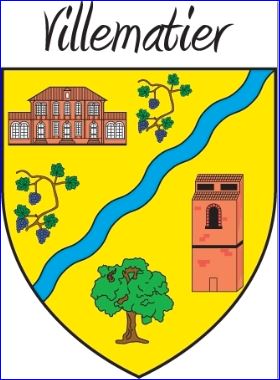 (2012) D'or à la cotice ondée en barre d'azur, accompagnée, en chef, de deux pampres de vigne au naturel rangés en barre et, à l'angle dextre du chef, de la mairie-école du lieu de gueules, ouverte et ajourée d'argent et, en pointe, du pigeonnier du lieu de gueules, ajouré de sable et d'un ormeau au naturel, rangés en barre.