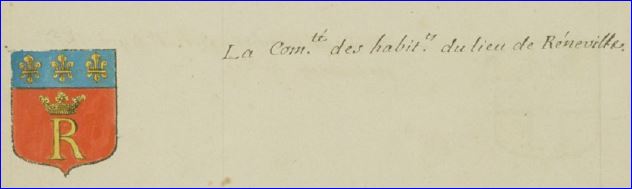 De gueules à la lettre capitale R couronnée d'or; au chef cousu d'azur chargé de trois fleurs de lis d'or.