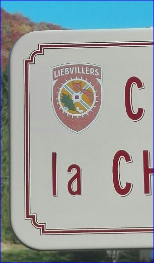 De gueules à la roue de moulin d'argent, remplie d'or, à quatre rais en sautoir d'azur bordé d'argent, le moyeu circulaire du même percé en carreau de gueules, l'or chargé, en chef, d'un masque de renard de gueules et d'une queue de renard du même, mouvant à senestre de la tête et brochant en bande sur le rai supérieur et, en pointe, de deux glands d'argent, feuillés de sinople à dextre, la feuille brochant en bande sur le rai inférieur, la roue surmontée du nom de la localité en lettres capitales d'argent; le tout enfermé dans une filière du même.