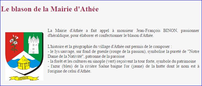 (2016) Tiercé en pairle renversé: au 1er de gueules à la tige de lis des jardin fleurie au naturel, au 2e de sinople à la tour forte du lieu, couverte et flanquée de deux échauguettes d'argent, au 3e d'argent à la fasce ondée d'azur et à la hutte d'or brochant en coeur.