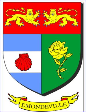 (2022) Parti: au 1er d’azur à la fasce d'argent chargée d'une coquille de gueules, au 2e de sinople à la rose des jardins d'or; le tout sommé d'un chef de gueules chargé de deux léopards affrontés d'or armés et lampassés d'azur.