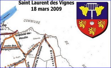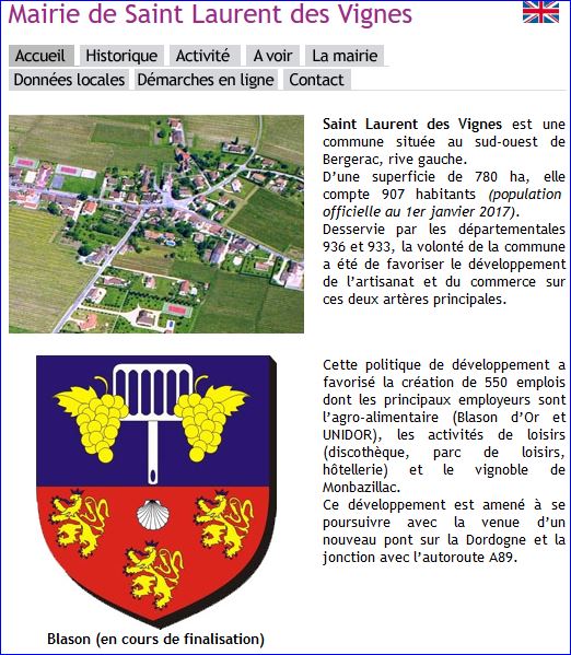 Coupé: au 1er d'azur au gril d'argent , posé en pal, la poignée en bas, accompagné de deux grappes de raisin feuillées d'or brochant en flancs sur le gril, au 2e de gueules à trois lionceaux d'or couronnés, armés et lampassés de sable, accompagnés en chef d'une coquille d'argent.