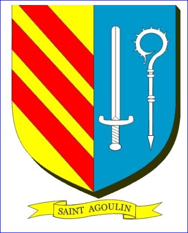 Parti: au 1er d'or à trois bandes de gueules, au 2 d'azur à l'épée haute d'argent à dextre et à la crosse du même à senestre.