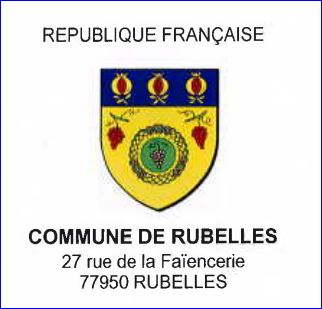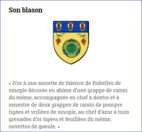 D'or à l'assiette de faïence de Rubelles de sinople ornée d'or et chargée d'une grappe de raisin, accompagnée en chef à dextre et à senestre de deux grappes de raisin de pourpre tigée et vrillée de sinople; au chef d'azur chargé de trois grenades d'or ouvertes de gueules.