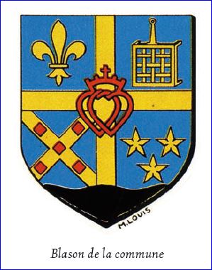 (1985) D'azur à la croix estrée d'or, cantonnée au 1er d'une fleur de lis d'or, au 2e d'un gril d'or posé en pal, la poignée vers le chef, au 3e d'un sautoir d'or chargé de cinq losanges de gueules posés à plomb, au 4e de trois étoiles d'or; à la plaine ondée de sable; à deux coeurs vidés et entravaillés, couronnés et croisetés de gueules, brochant en abîme.